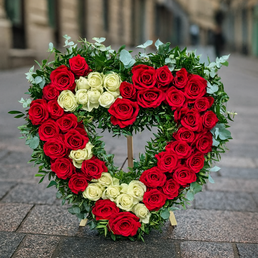 Componente: 34 x Trandafiri Rosii, 14 x Trandafiri Albi, Verdeata: Pistache, Eucalipt, 1 x Stativ cu burete, 1 x Panglica funerara, Dimensiune 55 cm