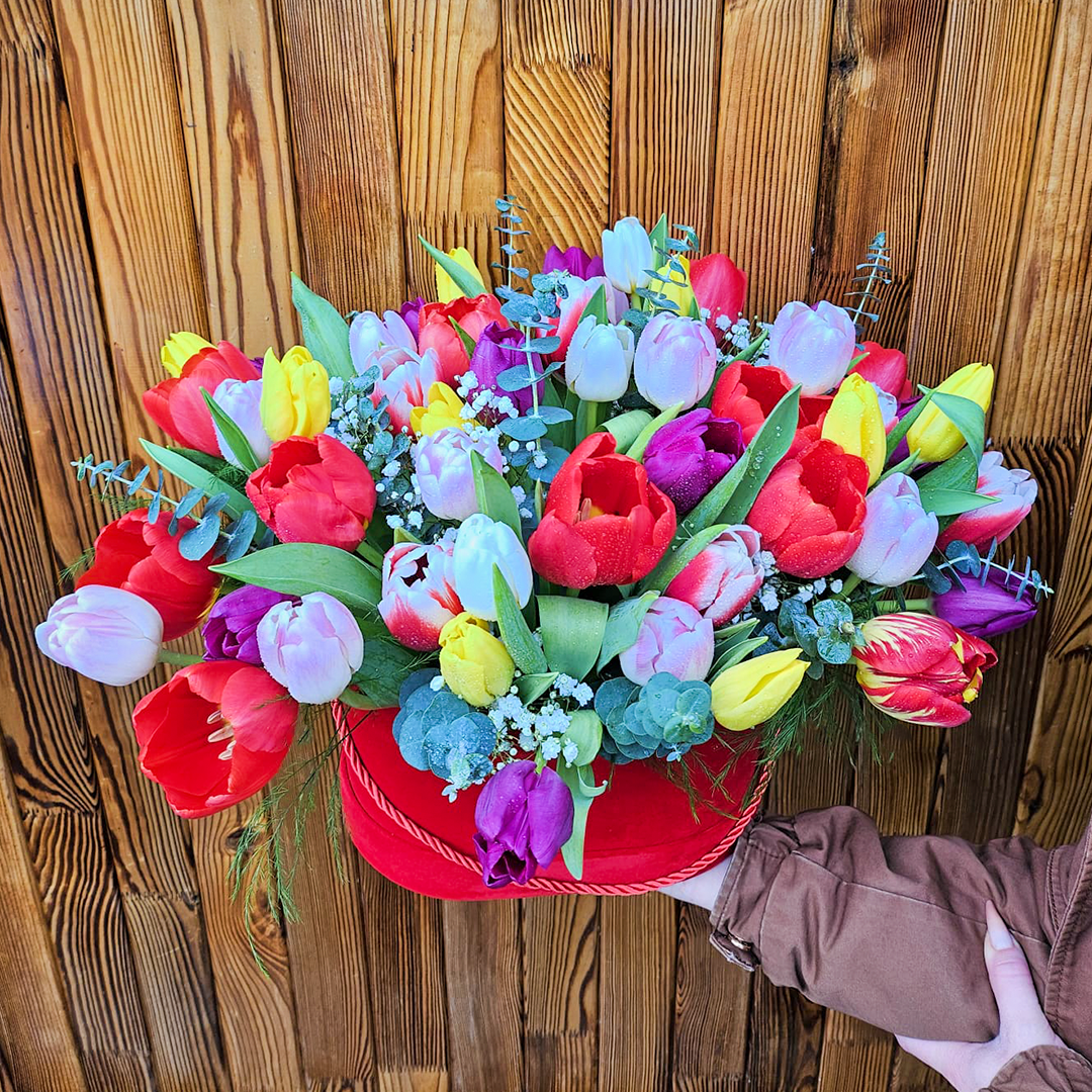 Componente: 49 x Lalea diverse culori, 5 x Gipsophylla, Verdeata, Treefern, Eucalipt, 1 x Felicitare FloraTrend, 1 x Burete, 1 x Cutie Catifea (culoarea uneia dintre flori)